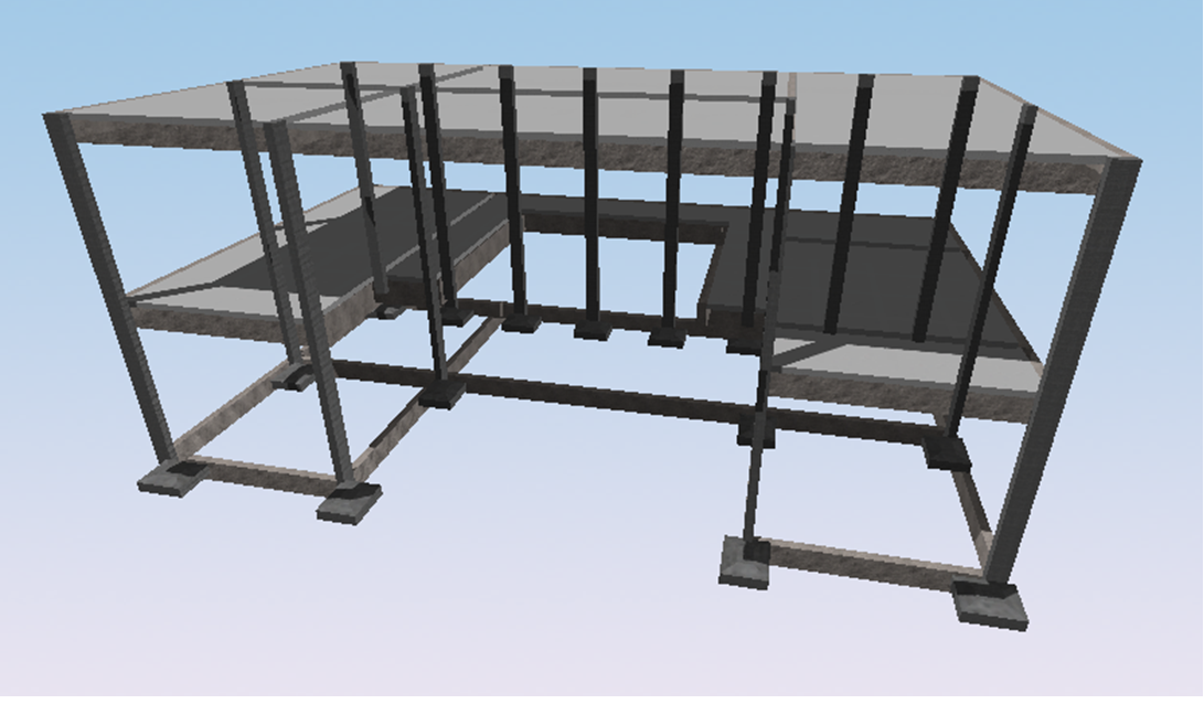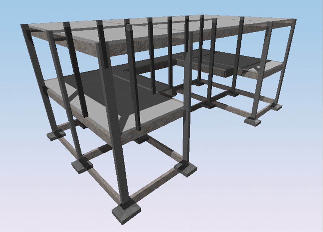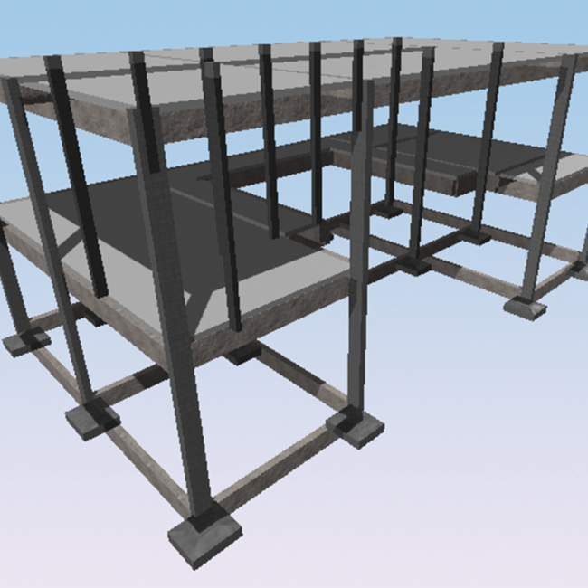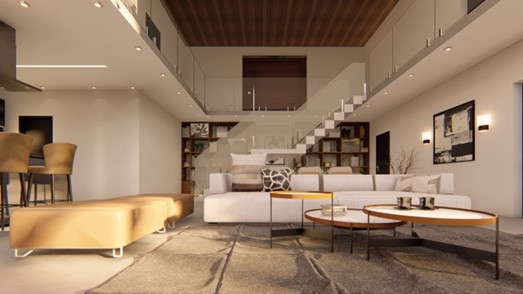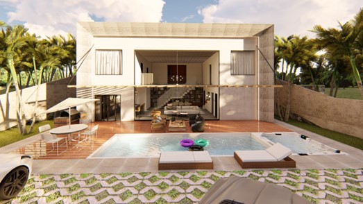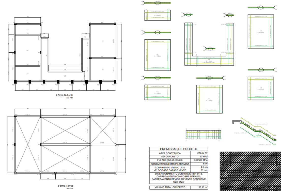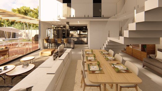 Casa de alto padrão de dois pavimentos e área total de 246 m² em condomínio de Brasília, Distrito Federal. O projeto arquitetônico previa grandes vãos e lajes em balanço. A solução estrutural foi pensada respeitando a arquitetura proposta. Destaque para o pé direito duplo e a escada central.