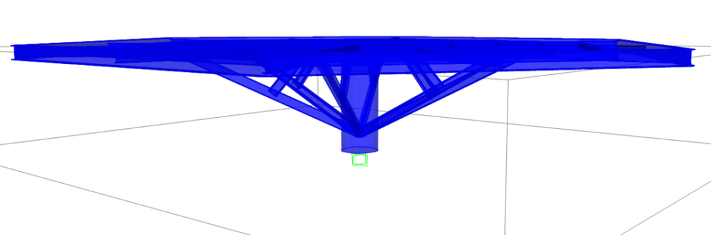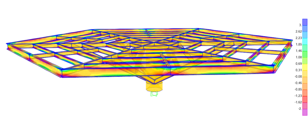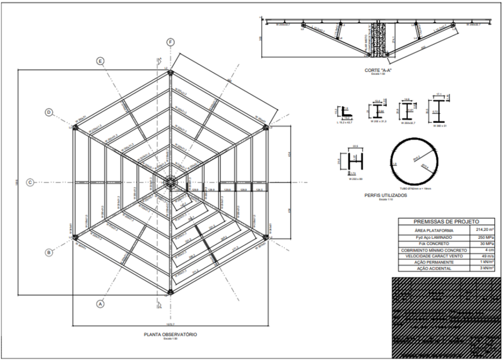 Estrutura metálica para plataforma de observação em formato hexagonal localizado em parque natural no município de Porto Velho, Rondônia. O acesso à plataforma, que possui 3,00 metros de altura, se dá por passarelas existentes. Toda a estrutura se apoia no pilar central circular de alta rigidez em estrutura mista com 110 centímetros de diâmetro. Dele saem seis diagonais que servem de sustentação para a plataforma, que possui mais de 18 metros em sua maior largura. Destaca-se o detalhamento das ligações, item essencial para a execução do projeto com assertividade e segurança.